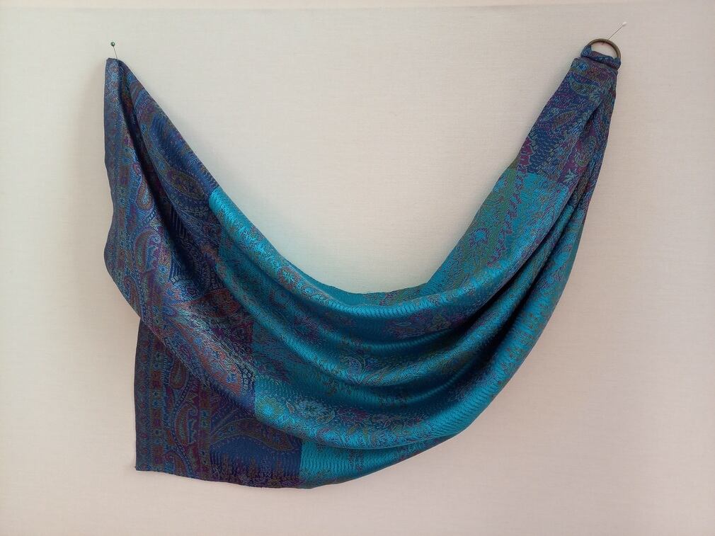 頭部にスカーフを合わせ、リングにもう一方の布端を通して軽く引っ張ることで、簡単に装着ができ、リング部分でサイズを調整します。