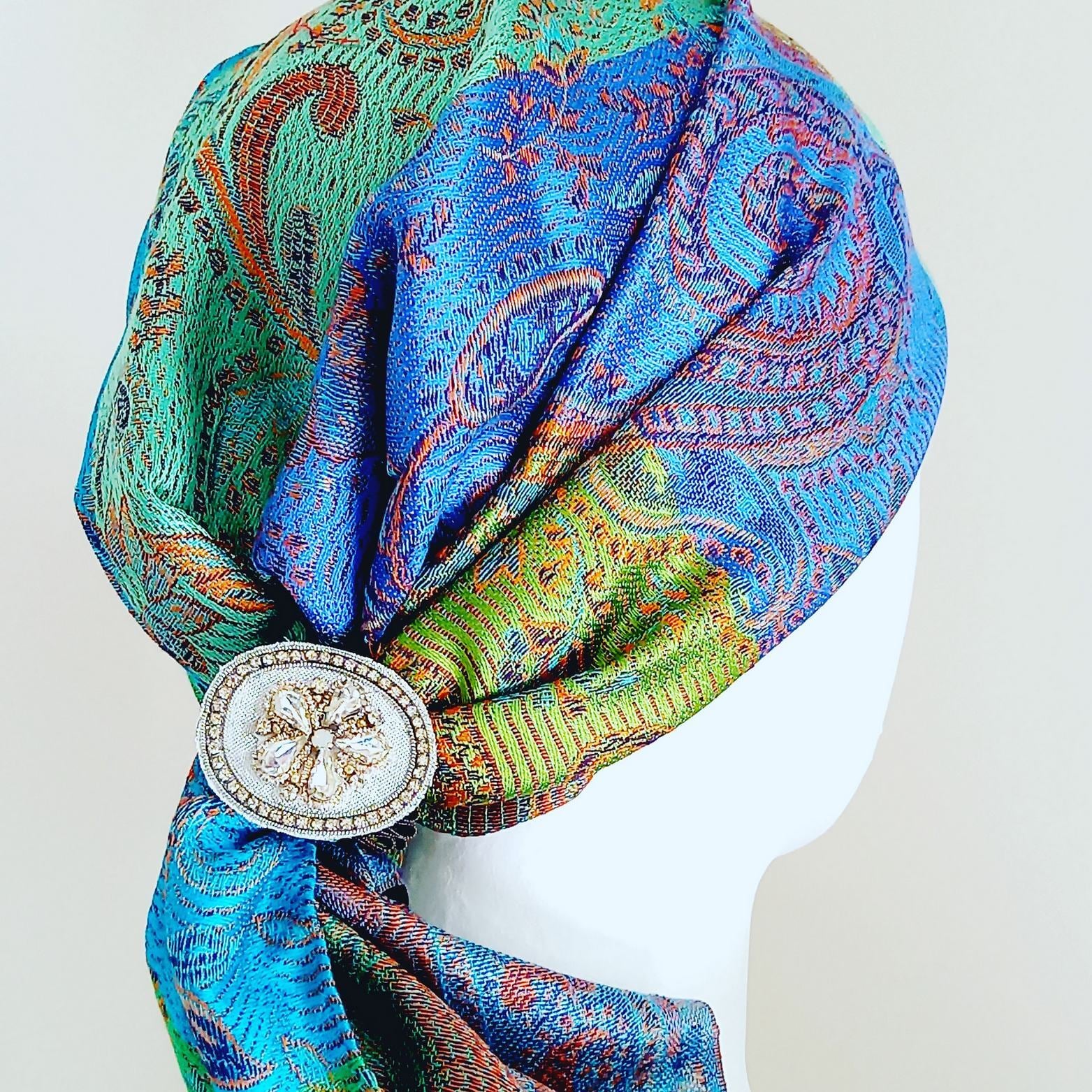 頭部にスカーフを合わせ、リングにもう一方の布端を通して軽く引っ張り、リング部分でサイズを調整します。